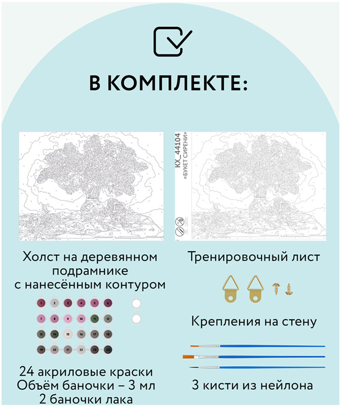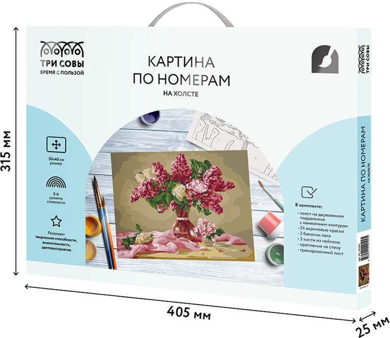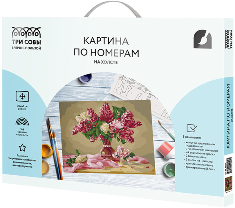 • холст на деревянном подрамнике 30×40 с нанесенным контуром, пронумерованный в соответствии с номерами красок. Контур под раскрашивание нанесен в том числе и на торцы подрамника, что позволяет разместить готовую работу на стене не обрамляя в багет или раму. Технология точной разбивки сюжета картины на разные цветовые оттенки гарантируют правильность исполнения полотна;