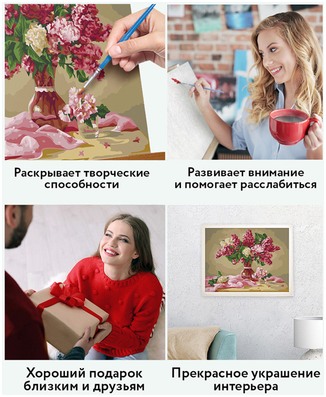 Картины по номерам на холсте — это увлекательное хобби, которое будет интересно как детям, так и взрослым. Сделает Вас ближе к изобразительному искусству и поможет раскрыть Ваши творческие способности. Данный метод рисования способствует развитию внимания и концентрации, аккуратности, пониманию концепции построения фигуры через цветовые оттенки, развивает чувство вкуса. Мы надеемся, что процесс рисования доставит Вам большое эстетическое удовольствие и созданные своими руками картины украсят интерьер Вашего дома или станут прекрасным подарком.