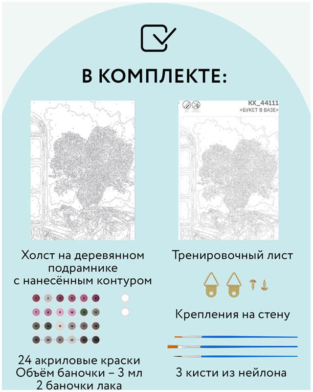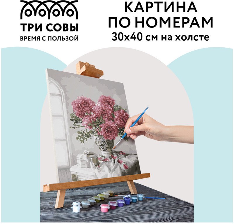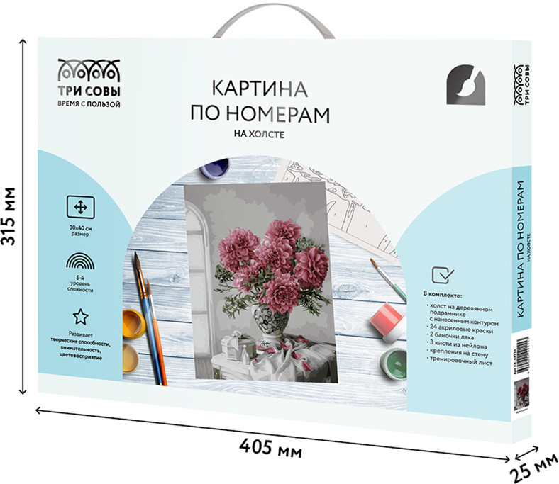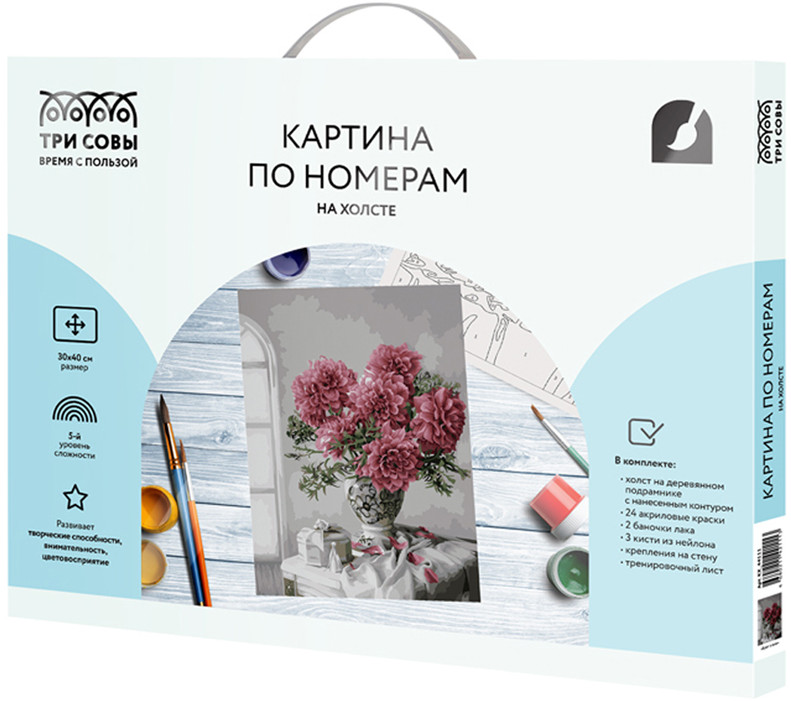 • холст на деревянном подрамнике 30×40 с нанесенным контуром, пронумерованный в соответствии с номерами красок. Контур под раскрашивание нанесен в том числе и на торцы подрамника, что позволяет разместить готовую работу на стене не обрамляя в багет или раму. Технология точной разбивки сюжета картины на разные цветовые оттенки гарантируют правильность исполнения полотна;