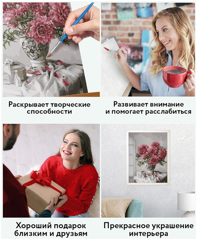 Картины по номерам на холсте — это увлекательное хобби, которое будет интересно как детям, так и взрослым. Сделает Вас ближе к изобразительному искусству и поможет раскрыть Ваши творческие способности. Данный метод рисования способствует развитию внимания и концентрации, аккуратности, пониманию концепции построения фигуры через цветовые оттенки, развивает чувство вкуса. Мы надеемся, что процесс рисования доставит Вам большое эстетическое удовольствие и созданные своими руками картины украсят интерьер Вашего дома или станут прекрасным подарком.