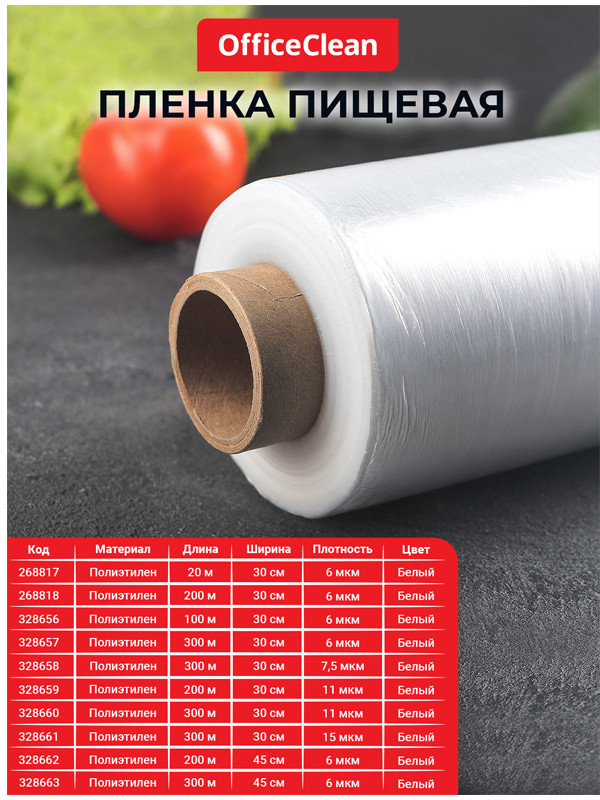 В данный момент этот товар отсутствует в продаже. Возможно, у нас найдется аналогичный или похожий товар здесь. Пленка пищевая OfficeClean — это пластиковое растягивающееся полотно, которое предназначено для упаковывания продуктов. В результате создается герметичная прочная упаковка, которая обеспечивает сохранность продуктов в процессе складирования, хранения и транспортировки. Пищевая пленка используется не только в быту, но и в розничной торговле, на производствах и складах.