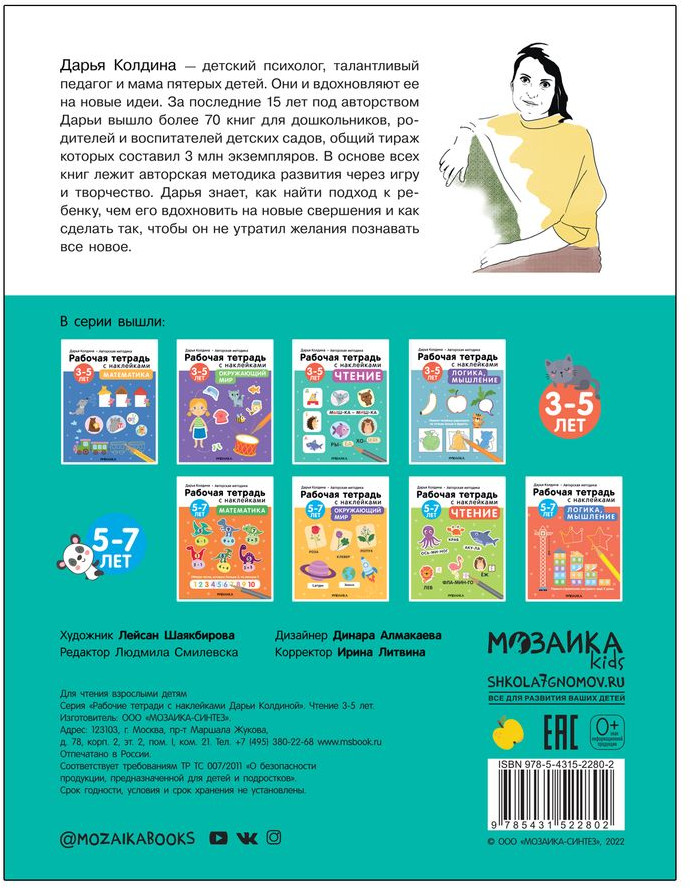 💳 Оплатить за товар можно при получении 🇰🇿 Есть бесплатная доставка по Казахстану от 1 дня 🎁 Копите бонусы с каждой покупки Серия: Рабочие тетради с наклейками Рабочая тетрадь «Чтение 3-5 лет» из серии «Рабочие тетради с наклейками. Авторская методика Дарьи Колдиной» предназначена для обучения и тренировки чтения у детей от 3 до 5 лет. Книга разработана педагогом и психологом Дарьей Колдиной на основе ее авторской методики развития через игру и творчество. Материал в рабочей тетради подается по мере усложнения в игровой форме: много разных, непохожих друг на друга, заданий, большое количество наклеек и иллюстрации, вызывающие эмоциональный отклик у ребенка. А в помощь взрослому в каждой книге есть советы и рекомендации от автора методики. |