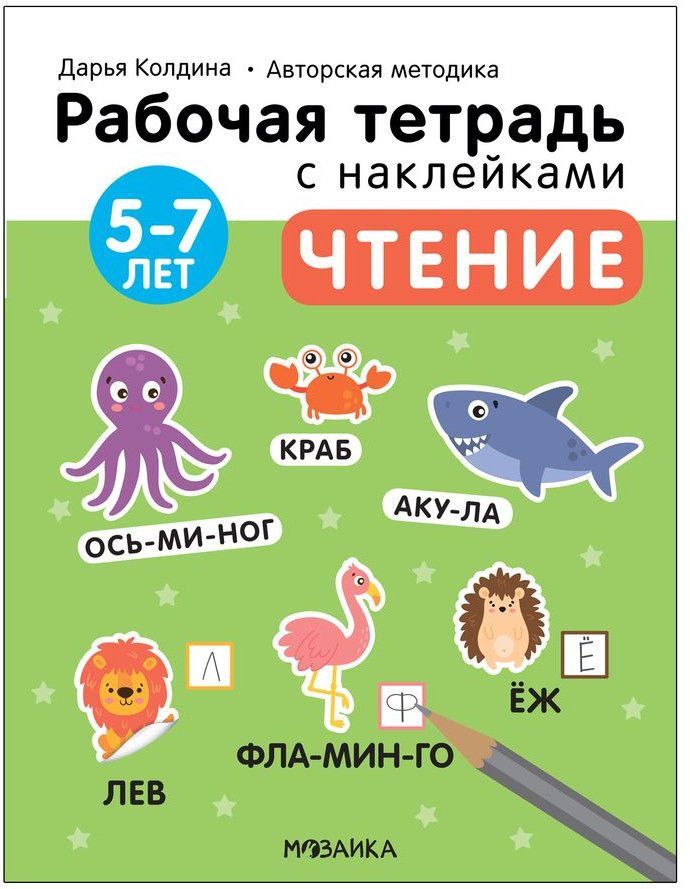 Рабочая тетрадь «Чтение 5-7 лет» из серии «Рабочие тетради с наклейками. Авторская методика Дарьи Колдиной» предназначена для обучения и тренировки чтения у детей от 5 до 7 лет. Книга разработана педагогом и психологом Дарьей Колдиной на основе ее авторской методики развития через игру и творчество. Материал в рабочей тетради подается по мере усложнения в игровой форме: много разных, непохожих друг на друга, заданий, большое количество наклеек и иллюстрации, вызывающие эмоциональный отклик у ребенка. А в помощь взрослому в каждой книге есть советы и рекомендации от автора методики.