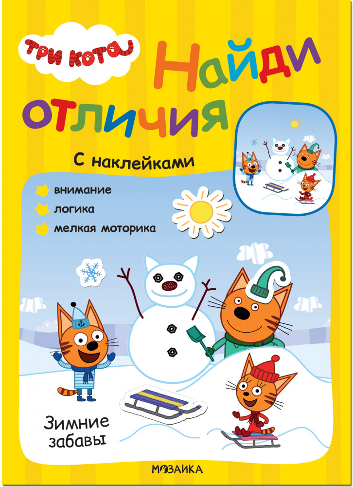 В книге «Зимние забавы» серии «Три кота. Найди отличия» ребенку предлагается решить увлекательные головоломки: рассмотреть внимательно картинку, сравнить ее с образцом, найти все отличия и затем сделать картинки одинаковыми с помощью наклеек. Это простая, но интересная механика не только нравится всем детям, но и развивает мелкую моторику, тренирует внимание.