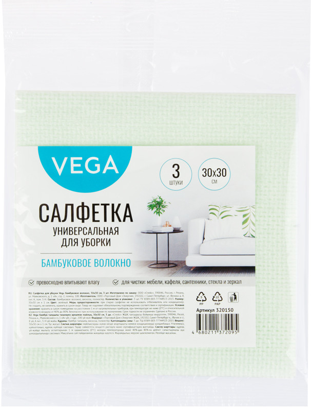 Vega Салфетки для уборкиВ данный момент этот товар отсутствует в продаже. Возможно, у нас найдется аналогичный или похожий товар здесь. Салфетки из бамбукового волокна универсальны в использовании, подходят для влажной и сухой уборки любых поверхностей. Особая крупноячеистая структура бамбукового полотна позволяет легко вымывать жир и грязь, не давая проявиться неприятным запахам. Благодаря прочности материала салфетки не растягиваются, не рвутся и надолго сохраняют свой первоначальный внешний вид. |