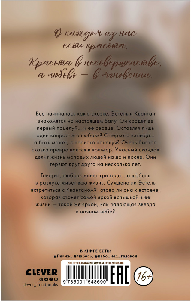 Падающая звездаВ данный момент этот товар отсутствует в продаже. Возможно, у нас найдется аналогичный или похожий товар здесь. Серия: #trendbooks Все начиналось как в сказке. Эстель и Квантан знакомятся на настоящем балу. Он крадет ее первый поцелуй... и ее сердце. Оставляя лишь один вопрос: это любовь? С первого взгляда... а быть может, с первого поцелуя? Очень быстро сказка превращается в кошмар. Ужасный скандал делит жизнь молодых людей на до и после. Они теряют друг друга на несколько лет. Говорят, любовь живет три года... а любовь в разлуке живет всю жизнь. Суждено ли Эстель встретиться с Квантаном? Готова ли она к встрече,которая станет самой яркой вспышкой в ее жизни — такой же яркой, как падающая звезда в ночном небе? |