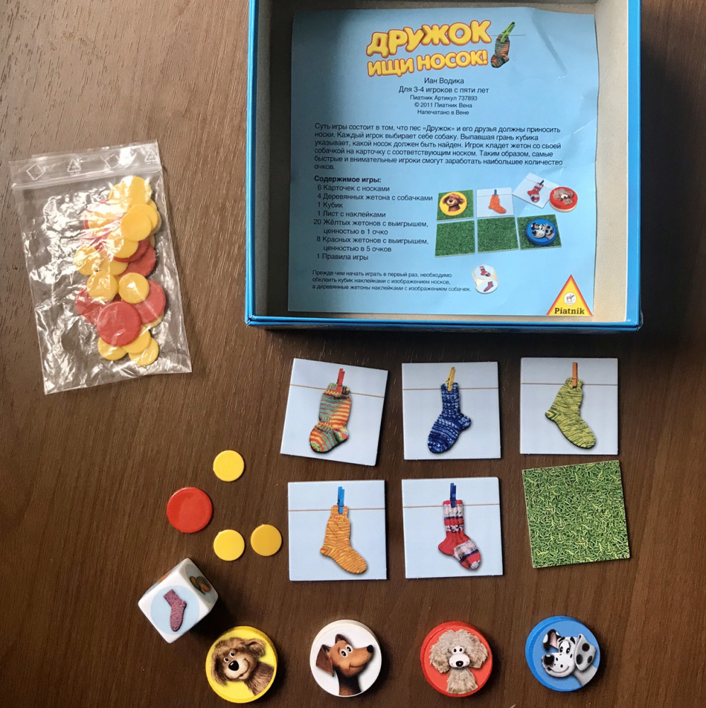 Очень хорошая игра. Во-первых качество. Все элементы приятно держать в руках. Во-вторых сама задумка игры. Заставляет мозги шевелиться, очень развивает память. Почему-то очень сложно запомнить расположение 6 разных носков, даже взрослому)) Жетоны с очками добавляют азарта. Собачки очень милые))