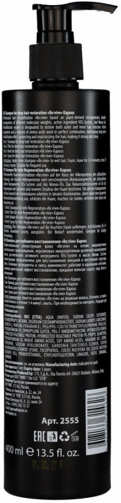 Kapous Professional Шампунь для глубокого восстановления волосВ данный момент этот товар отсутствует в продаже. Возможно, у нас найдется аналогичный или похожий товар здесь. Серия: Re:vive Профессиональная реконструкция «Re:vive» на основе микропротеинов растительного происхождения, кератиновых микропротеинов различной молекулярной массы, растительного активного ингредиента VEG-System и масла монои. Система реконструкции предназначена для восстановления внешней и внутренней структуры волос. Активные ингредиенты и смесь аминокислот работают в идеальном сочетании, развивая длительный эффект восстановления, придавая волосам защиту, силу, блеск и увлажнение. |