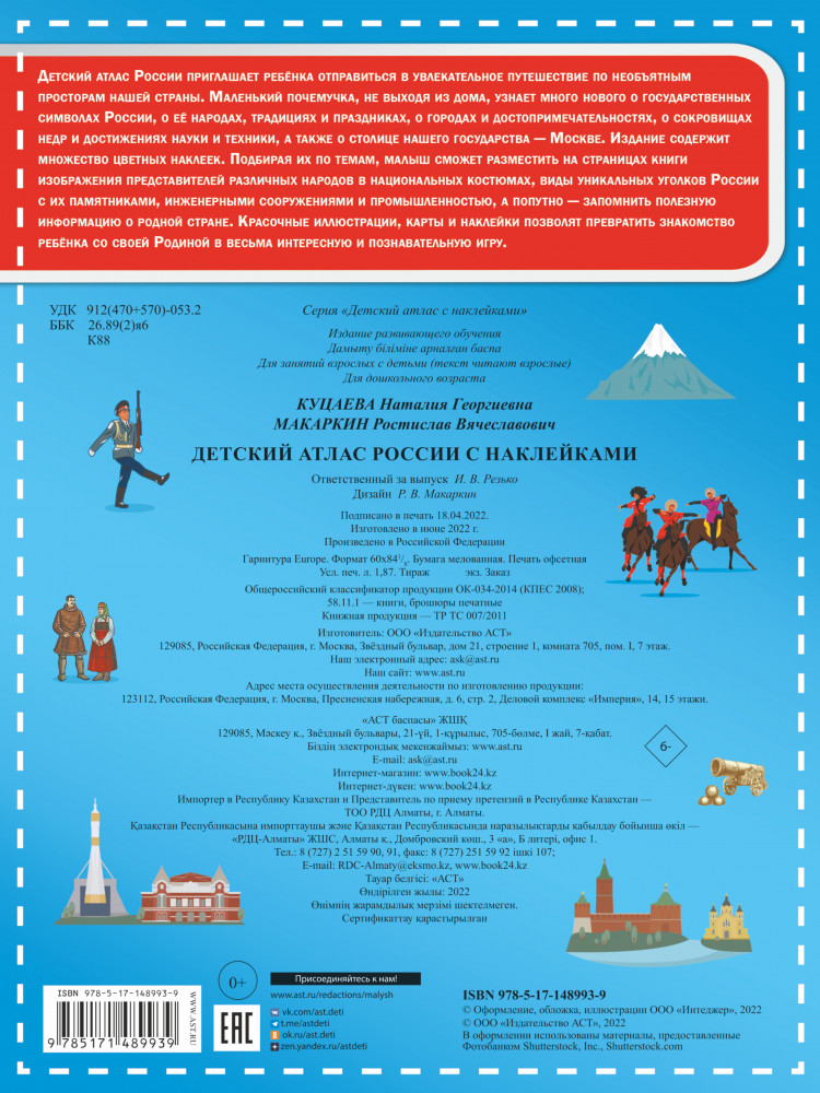 💳 Оплатить за товар можно при получении 🇰🇿 Есть бесплатная доставка по Казахстану от 1 дня 🎁 Копите бонусы с каждой покупки Серия: Детский атлас с наклейками Детский атлас России приглашает ребёнка отправиться в увлекательное путешествие по необъятным просторам нашей страны. Маленький почемучка, не выходя из дома, узнает много нового о государственных символах России, о её народах, традициях и праздниках, о городах и достопримечательностях, о сокровищах недр и достижениях науки и техники, а также о столице нашего государства — Москве. |