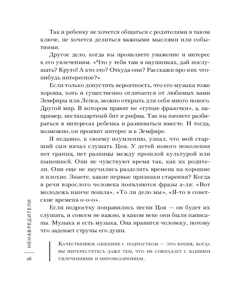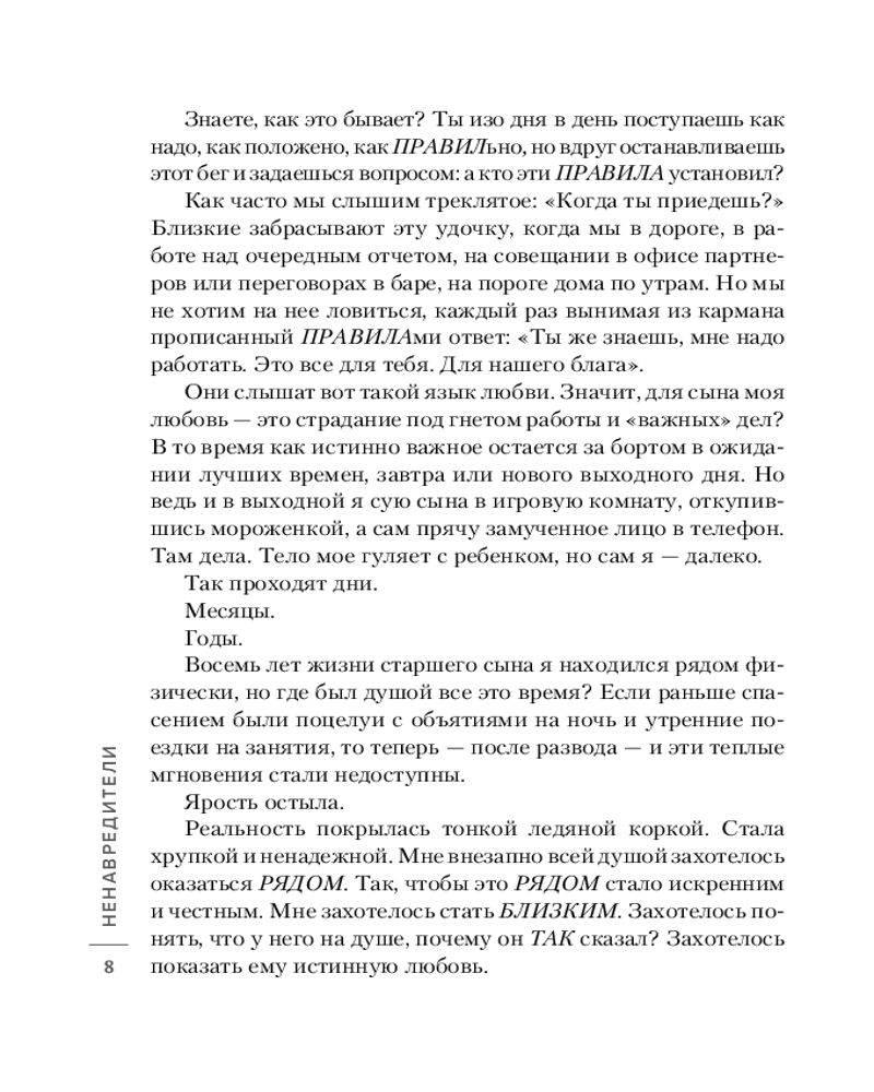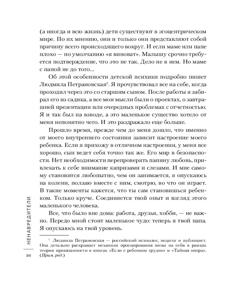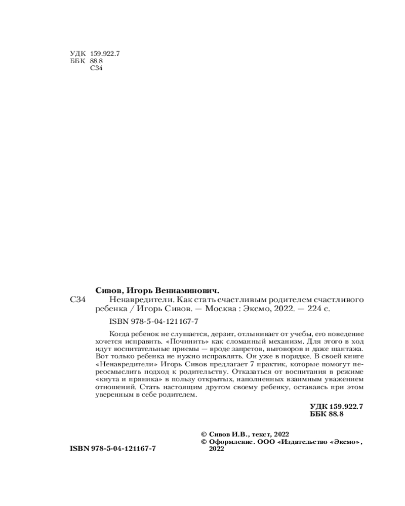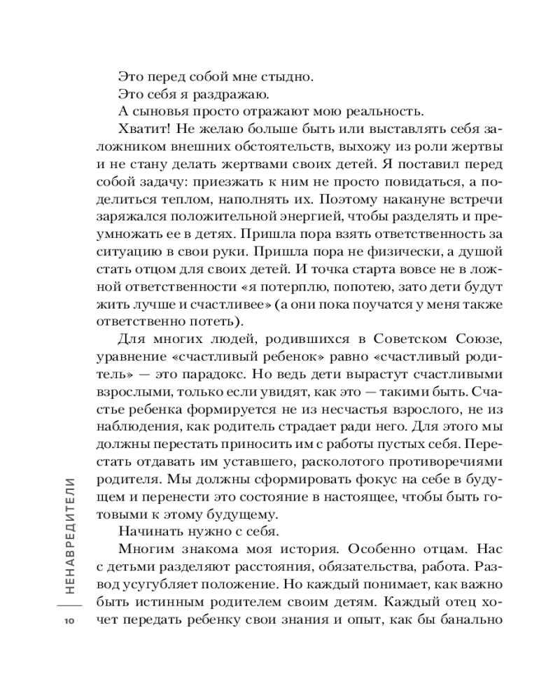 В своей книге «Ненавредители» Игорь Сивов предлагает 7 практик, которые помогут переосмыслить подход к родительству. Отказаться от воспитания в режиме «кнута и пряника» в пользу открытых, наполненных взаимным уважением отношений. Стать настоящим другом своему ребенку, оставаясь при этом уверенным в себе родителем.