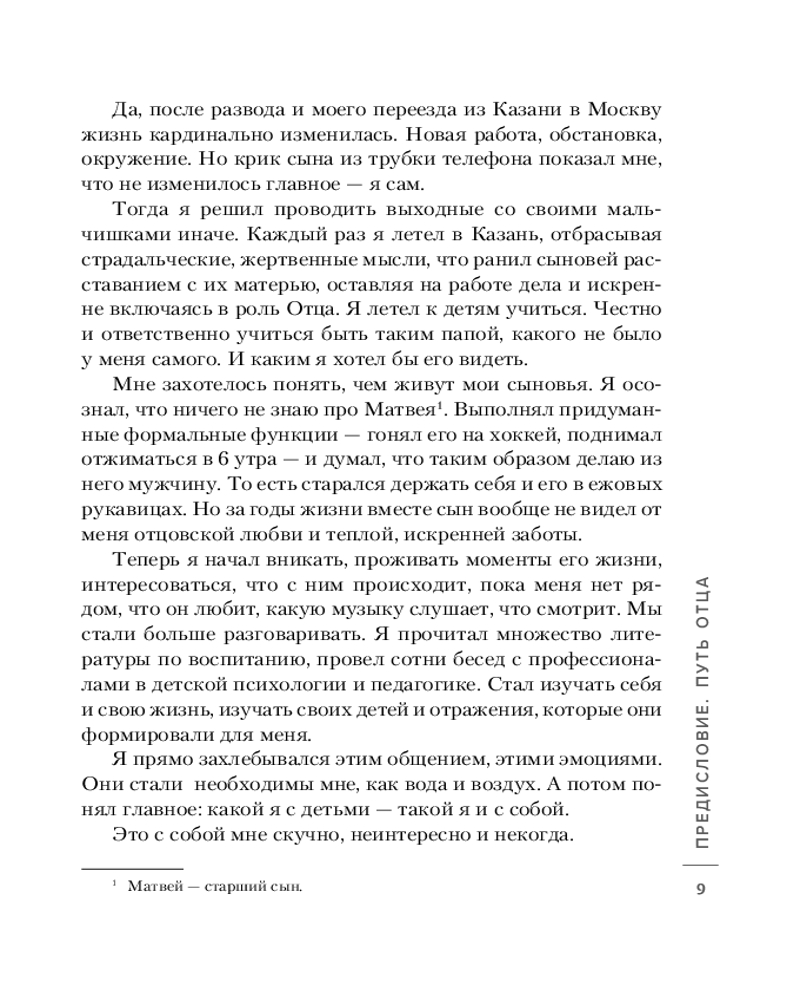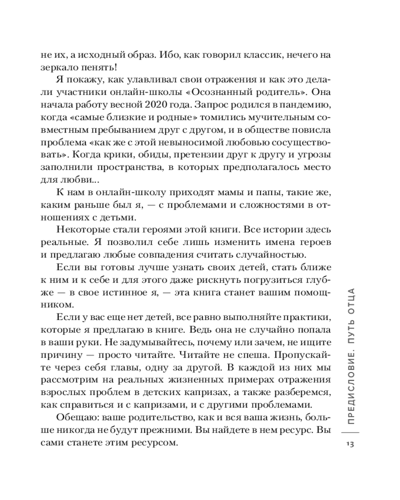 «В жизни мы исполняем много разных ролей: супруга или супруги, подчиненного и руководителя, друга и брата (сестры), ребенка и родителя. И чем лучше мы справляемся с каждой из ролей, тем полнее и радостней наша жизнь. И, наоборот, причина самых больших страданий — осознание, что с ролью не справляешься: «я плохая мать», «я никудышний друг», «я бездарный руководитель». Если бы можно было составить рейтинг, то, без сомнений, самым болезненным осознанием стало бы «я плохо справился с ролью родителя». И, увы, в отличие от многих других ролей, эту роль уже нельзя переиграть заново. Спектакль завершен, занавес опущен, ребенок вырос и сам стал взрослым человеком. И с этим жить. Но как же справиться с этой непростой ролью? Нет режиссера. Нет суфлера. Нет даже сценария.