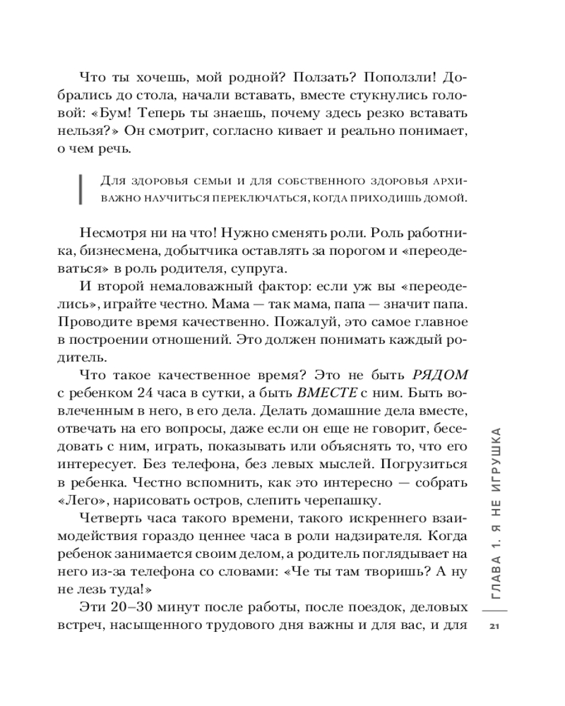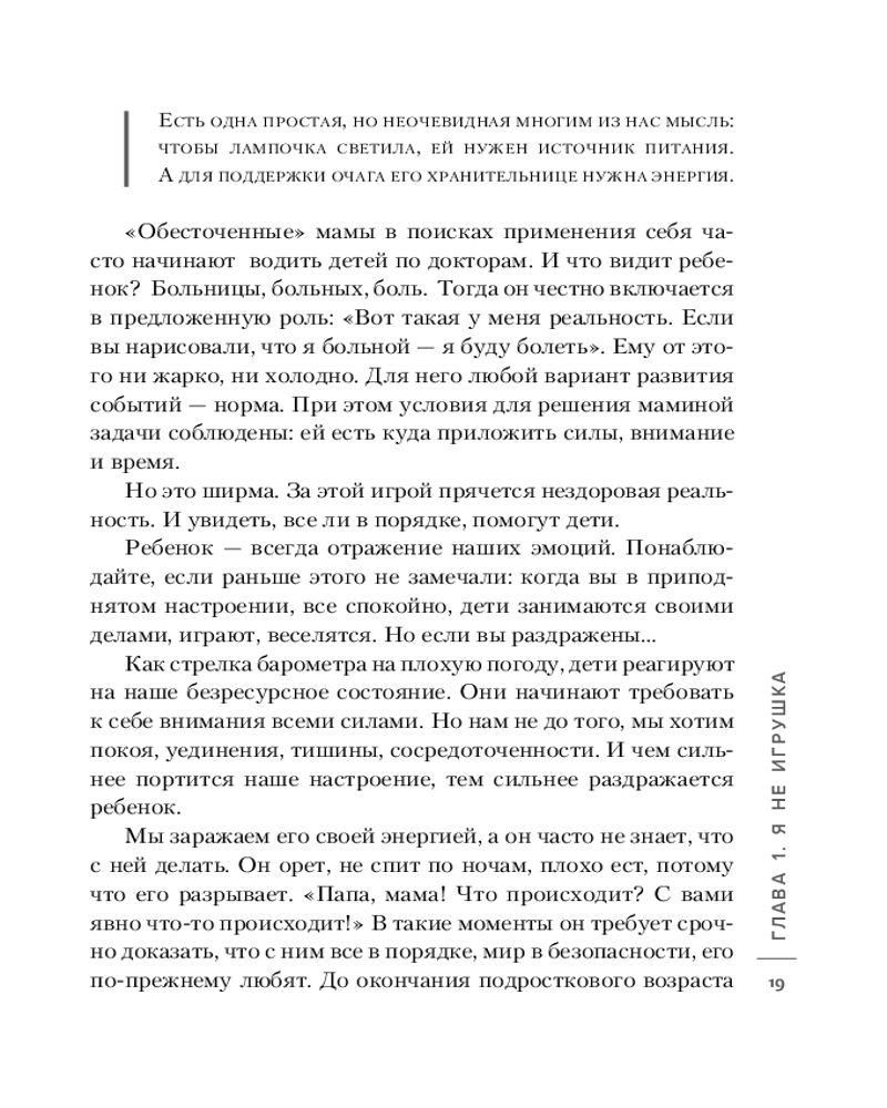 Не надейтесь, никто и никогда не напишет вам универсальной инструкции по воспитанию детей, по исполнению роли родителя. Но, опираясь на опыт, знания и идеи тех, кто задумался о том, как нам лучше справиться с ролью родителя, мы сможем составить собственный сценарий и сыграть эту роль наилучшим образом. Не ожидая аплодисментов и восторженных отзывов критиков. И даже не ожидая благодарности от наших детей.