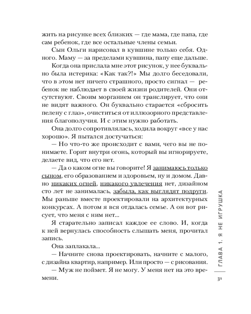 Книга Игоря Сивова «Осознанное родительство» — из тех ориентиров в этой сложной и ответственной теме. Пока я читал и перечитывал ее главы, я соглашался и спорил с автором, я сопереживал ему и переосмысливал свои поступки, восхищался точностью метафор и аргументов, смеялся и надолго погружался в задумчивость. Если для вас тема родительства еще актуальна, потратьте несколько часов на ее прочтение, усовершенствуйте себя в роли родителя, подарите себе и своим детям больше радости в спектакле, который играется всего один раз, — в спектакле под названием «жизнь».. |