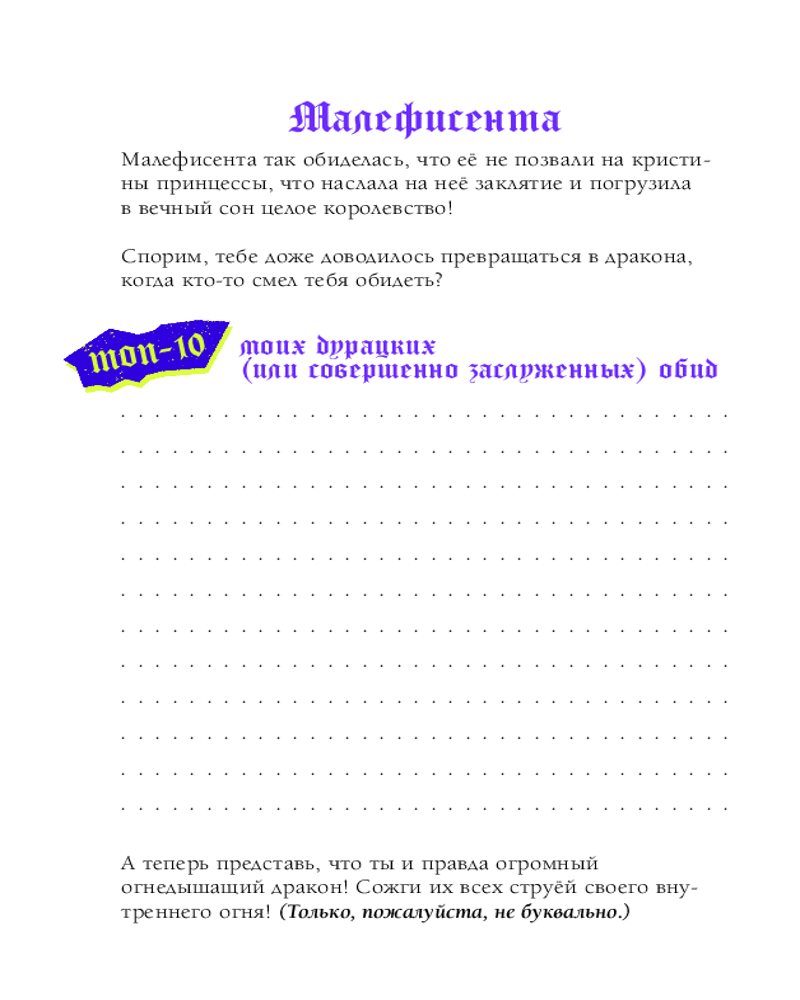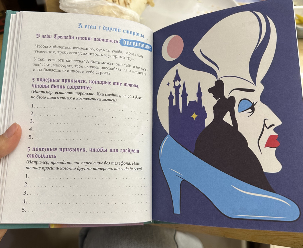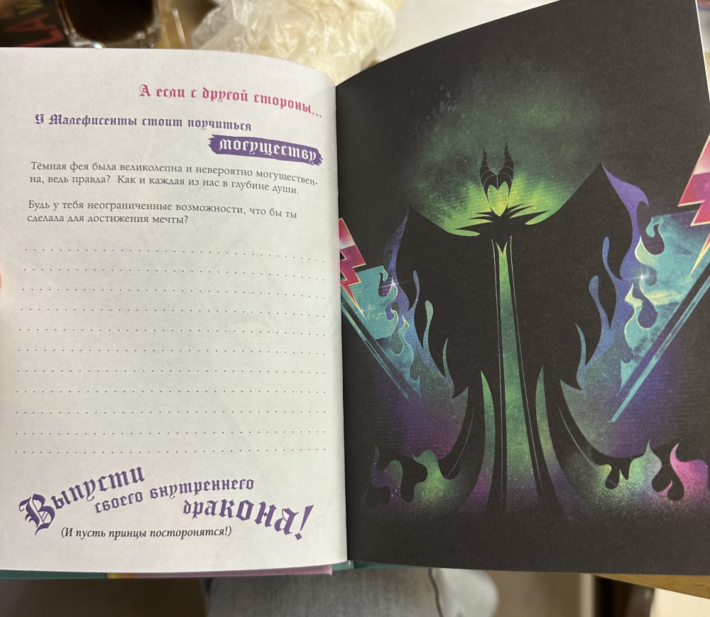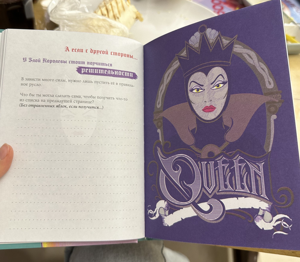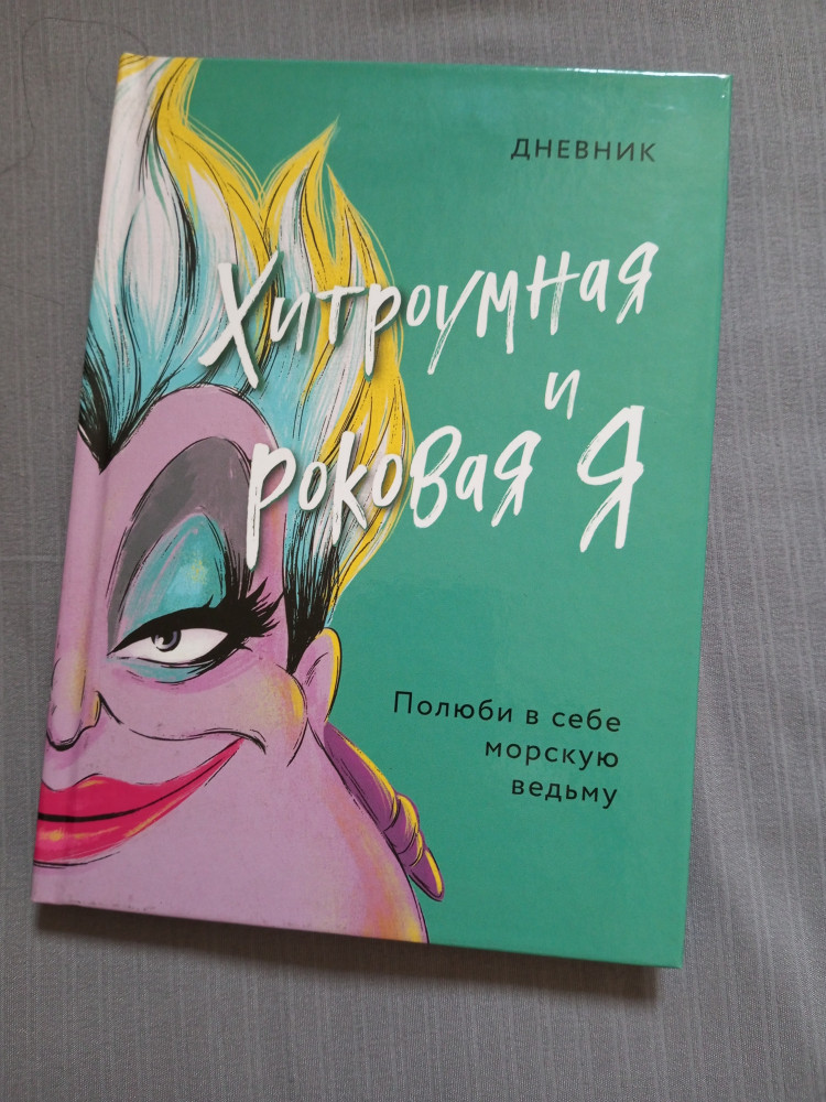 Отличный блокнот в красочном твердом переплете! Содержание включает в себя цитаты и арты с диснеевскими злодеями, в числе которых не только Урсула, но также Малефисента, Гастон, Джафар и другие. Есть пометка 12+, а это значит, что детям помладше блокнот может не подойти из-за заданий внутри.