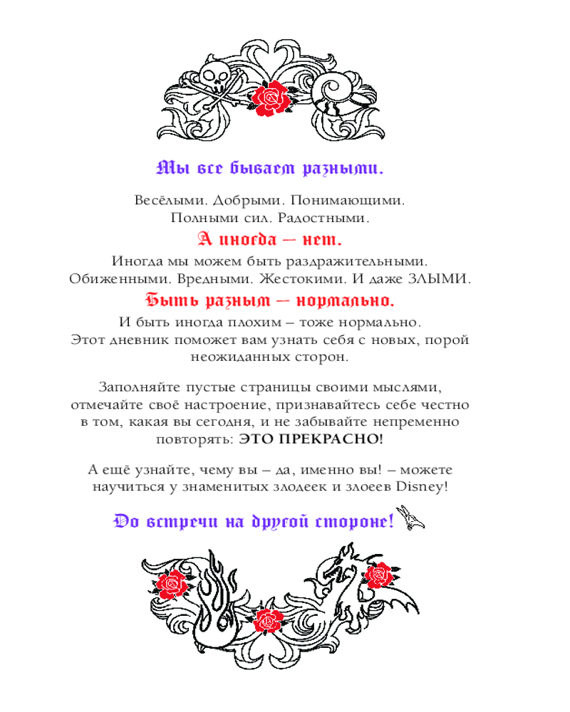 Дневник с опросниками, очень прикольные рисуночки по всем Злодеям Дисней. Писать я скорее всего там ничего не буду, но мне понравилось