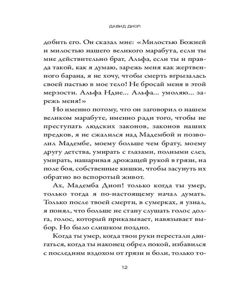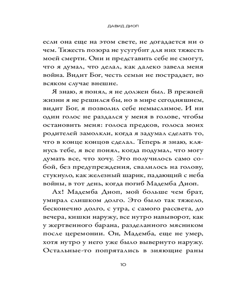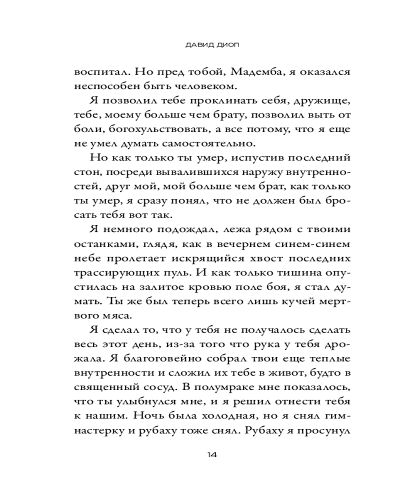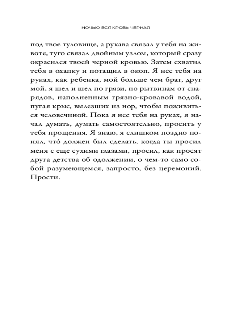 Насквозь пронизанный пулями и языческой магией, «Ночью вся кровь черная» напоминает о забытой главе в истории Первой мировой войны. Смешав традиции устного повествования с сухим журналистским описанием ужасов жизни в окопах, Давид Диоп создал необычайную по силе и поражению историю о погружении человека в безумие. |