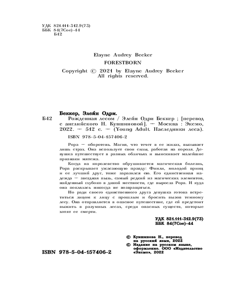 Рожденная лесомВ данный момент этот товар отсутствует в продаже. Возможно, у нас найдется аналогичный или похожий товар здесь. Рора — оборотень. Магия, что течет в ее жилах, вызывает лишь страх. Она использует свои силы, работая на короля. Девушка путешествует в разных обличьях и выискивает малейшие признаки мятежа. Когда на королевство обрушивается магическая болезнь, Рора раскрывает ужасающую правду: Финли, молодой принц и ее лучший друг, тоже заразился ею. Его единственная надежда — звездная пыль, самый редкий из магических элементов, найденный глубоко в дикой местности, где выросла Рора. И куда она поклялась никогда не возвращаться. Но ради своего единственного друга девушка готова встретится лицом к лицу с прошлым и бросит вызов темному лесу. Она отправляется в опасное путешествие, где ей предстоит выжить в разумных лесах, среди опасных существ, которые хотят ее смерти. |