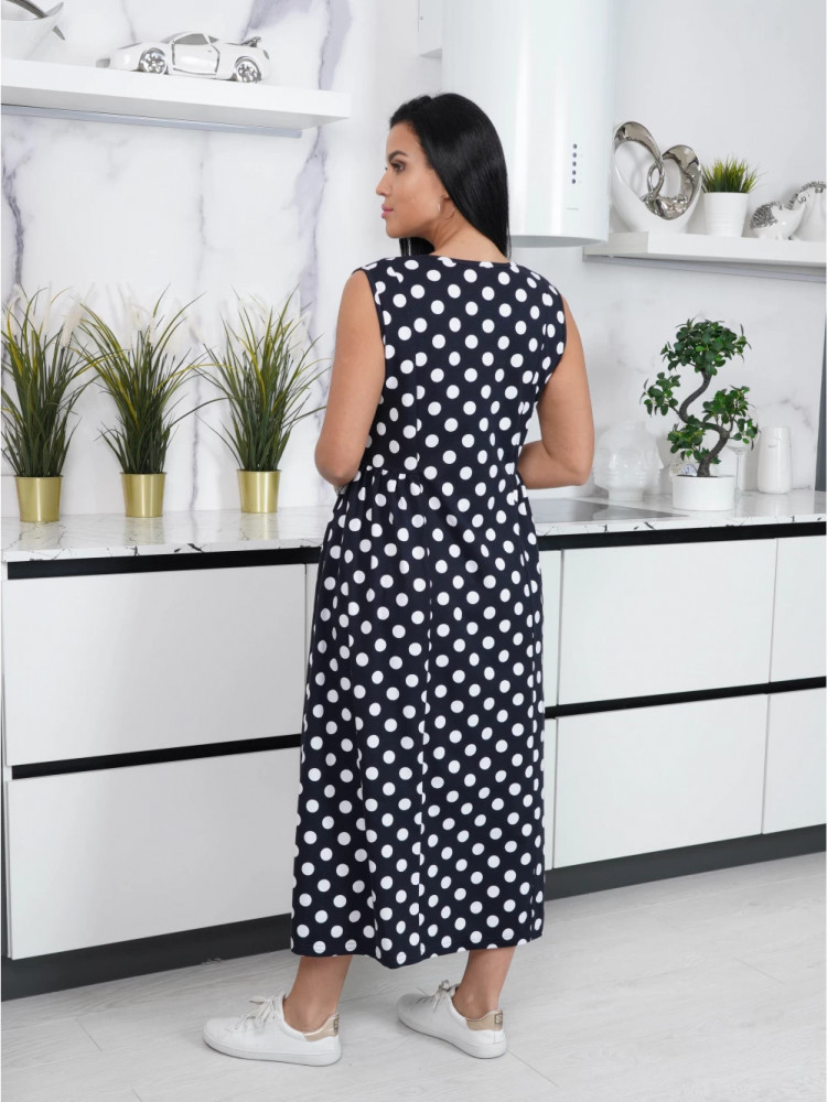 Платье мне понравилось, взяла 48 размер на мои параметры очень хорошо сидит по фигуре, в меру свободное, а ткань в горох всегда актуально. При первой стирке слегка линяло, швы ровные, не перекосило после стирки.
