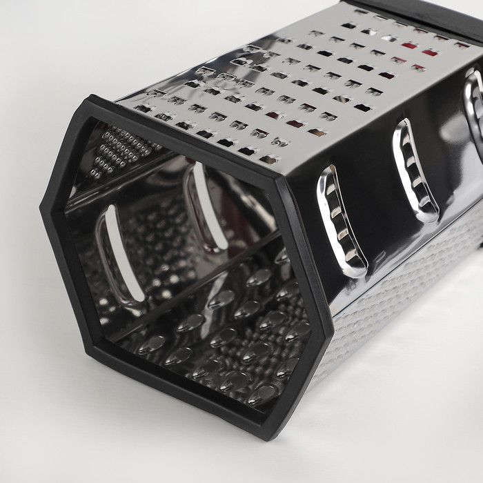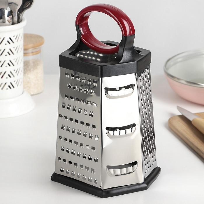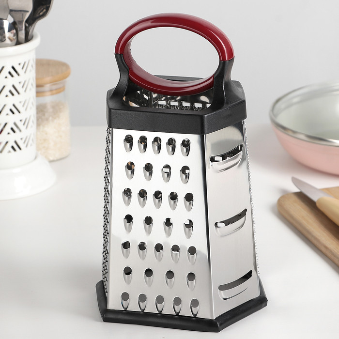 Терка оснащена четырьмя рабочими поверхностями, предназначенными для мелкой, средней и крупной терки. Устройство устойчиво к коррозии, механическим повреждениям и износу, поскольку при изготовлении использовали качественный материал — нержавеющую сталь. В конструкции терки предусмотрена ручка удобной формы, что создает комфортные условия при эксплуатации. Модель отличается легкостью веса, поэтому процесс измельчения овощей и фруктов не требует особых усилий.