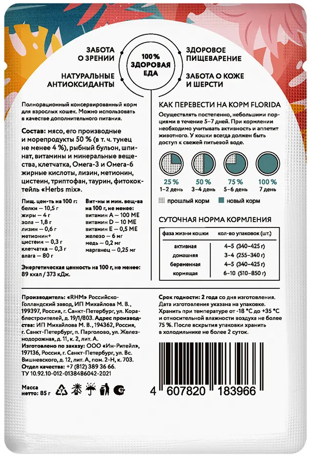 Florida Корм для взрослых кошек «Кусочки с тунцом и шпинатом»