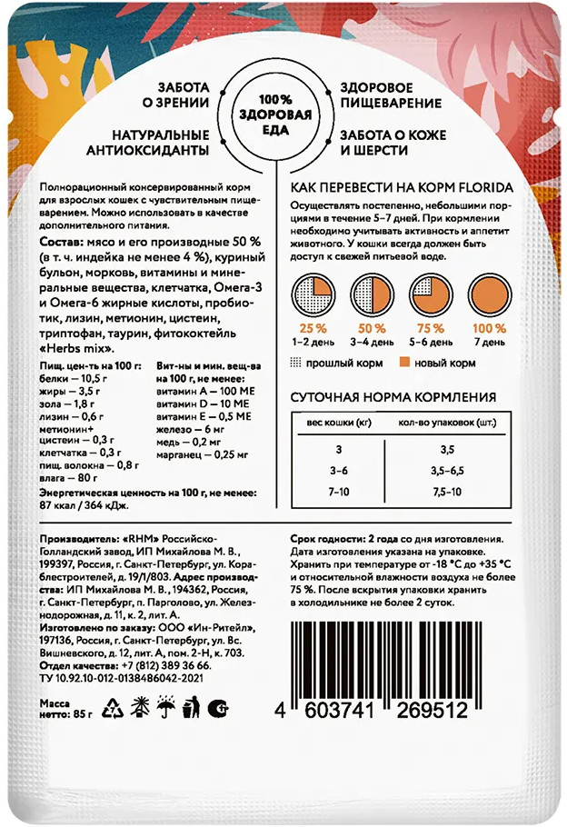 Florida Корм для взрослых кошек с чувствительным пищеварением «Кусочки с индейкой и морковью»