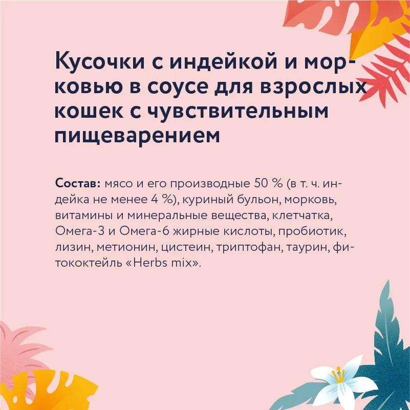 Отзывы «Корм для взрослых кошек с чувствительным пищеварением «Кусочки с индейкой и морковью»»