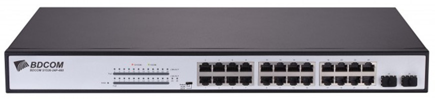 Коммутатор, BDCOM, S1526-24P, неуправляемый, 24 порта PoE 10/100/1000M RJ45, 2 порта 1000M SFP, бюджет PoE 370W, supports standard/VLAN/CCTVmode, стоечный 1U.