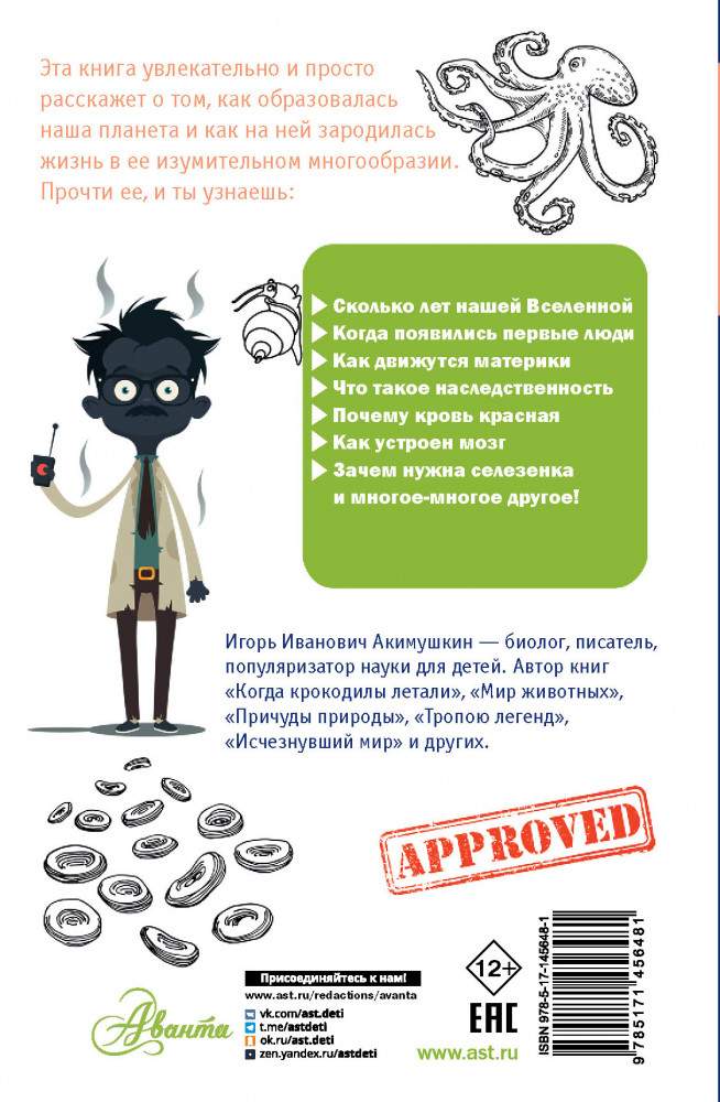 💳 Оплатить за товар можно при получении 🇰🇿 Есть бесплатная доставка по Казахстану от 1 дня 🎁 Копите бонусы с каждой покупки Серия: Простая наука для детей Книга советского биолога, писателя и популяризатора науки для детей Игоря Акимушкина «Занимательная биология» расскажет о том, как образовалась наша планета и как на ней зародилась жизнь во всем ее многообразии. Вы узнаете, как движутся материки, когда на Земле появились первые люди, кого можно назвать предком современного человека, у всех ли живых существ кровь красного цвета, как работает наш мозг и сердце и многое другое. |