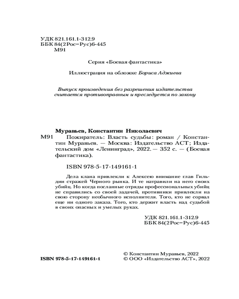 💳 Оплатить за товар можно при получении 🇰🇿 Есть бесплатная доставка по Казахстану от 1 дня 🎁 Копите бонусы с каждой покупки Серия: Боевая фантастика Дела клана привлекли к Алексею внимание глав Гильдии стражей Черного рынка. И те натравили на него своих убийц. Но когда посланные отряды профессиональных убийц не справились со своей задачей, противники привлекли на свою сторону необычного исполнителя. Того, кто не сорвал еще ни одного заказа. Того, кто держит власть над судьбой в своих опасных и умелых руках. |