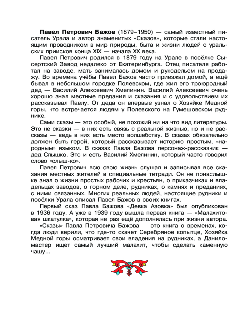 💳 Оплатить за товар можно при получении 🇰🇿 Есть бесплатная доставка по Казахстану от 1 дня 🎁 Копите бонусы с каждой покупки Серия: Лучшие сказочники В книгу «Малахитовая шкатулка» вошли самые знаменитые сказы Павла Петровича Бажова, которые входят в школьную программу, — «Серебряное копытце», «Медной горы Хозяйка», «Малахитовая шкатулка», «Каменный цветок» и «Горный мастер». В тексте есть сноски, где объяснены диалектные и устаревшие слова, а в начале книги читателей ждёт предисловие, которое позволит поближе познакомиться с автором. Добро пожаловать в мир уральских сказов! |