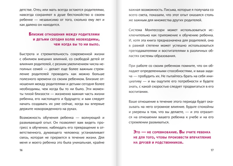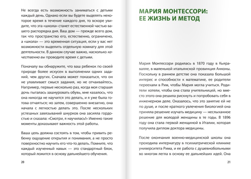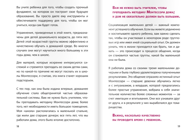 Все хорошо изложено, что и как, и для чего! И также для какого возраста! Но надо учесть, что автор придерживался методики и как говорила сама Монтессори у каждого ребенка свое время и свое индивидуальное развитие. Поэтому не надо точь в точь придерживаться в играх возрастных особенностей, надо ребенку предлагать все, что там есть, а дальше он сам выберет, что ему интересно. Так что это нормально, когда вдруг ребенок в 1,5 года выбирает игру для 3х летних! Это особенности каждого маленького индивида! А нам родителям просто надо наблюдать и если понадобиться, то помочь. Книга очень хорошая! Все описано понятно и написано читабельно! Советую всем!