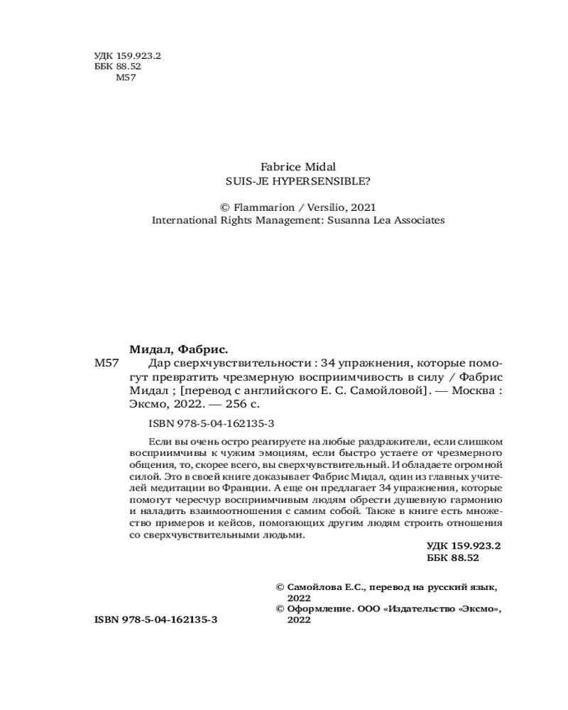 В данный момент этот товар отсутствует в продаже. Возможно, у нас найдется аналогичный или похожий товар здесь. Серия: Искусство самопринятия Нетерпимость к шуму, резкие перепады настроения, острое переживание любых неудач и чрезмерная восприимчивость — все это могут испытывать сверхчувствительные люди. И в этом их дар, считает философ и основатель Западной школы медитации Фабрис Мидал.