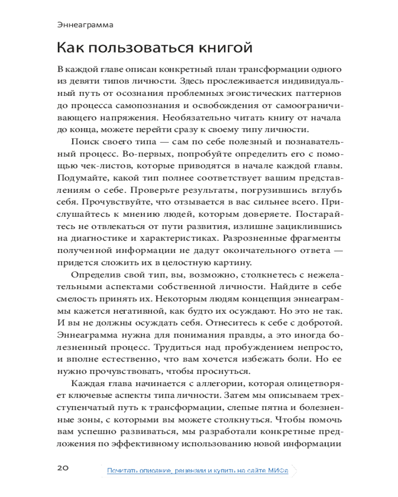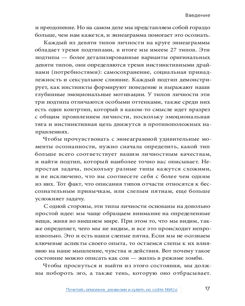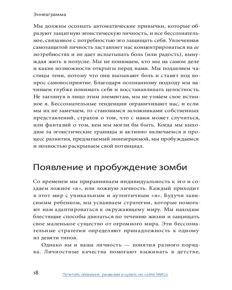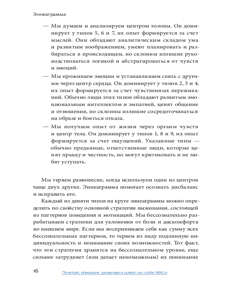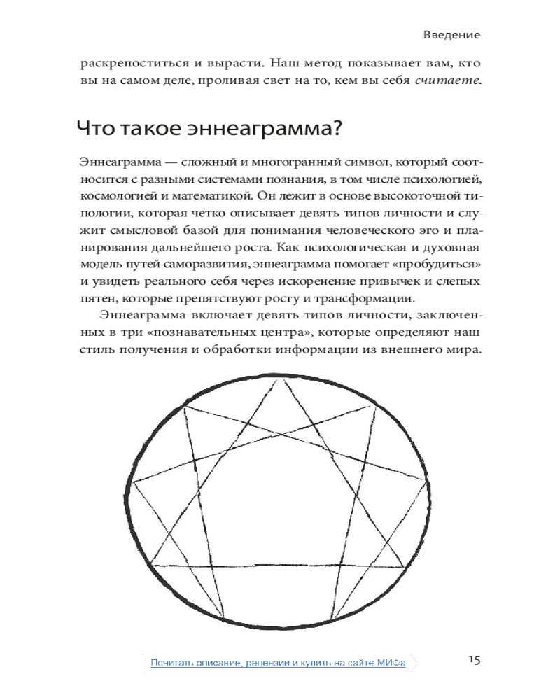 Как психологическая и духовная модель путей саморазвития, эннеаграмма помогает «пробудиться» и увидеть реального себя через искоренение привычек и слепых пятен, которые препятствуют росту и трансформации. Эннеаграмма включает девять типов личности, заключенных в три «познавательных центра», которые определяют наш стиль получения и обработки информации из внешнего мира.