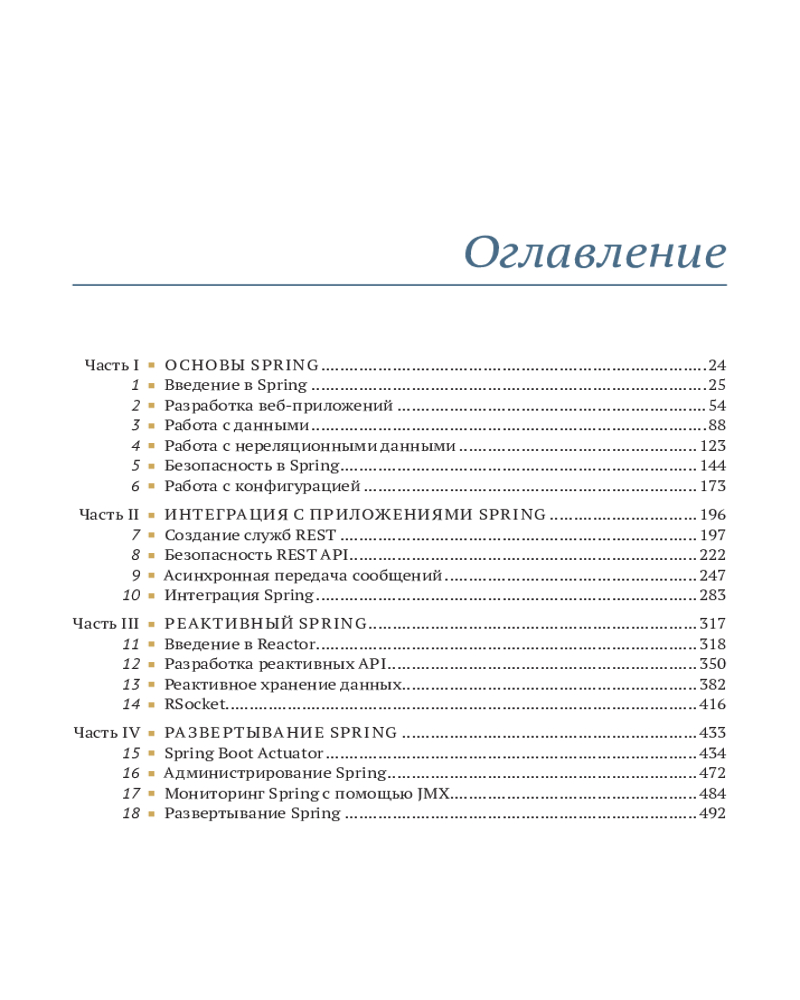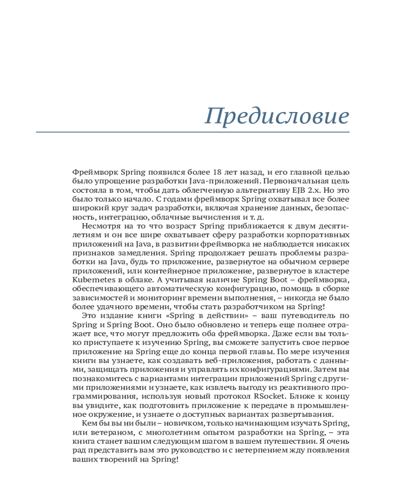 Отличная книга, самое то для погружения в Spring, множество примеров кода, шаг за шагом рассматриваются реальные задачи и их решения. Думаю, что данная книга прекрасно подойдет как новичкам, так и опытным разработчикам, желающим углубить свои знания.