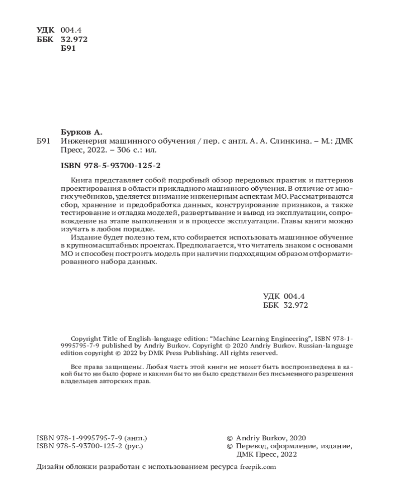 💳 Оплатить за товар можно при получении 🇰🇿 Есть бесплатная доставка по Казахстану от 1 дня 🎁 Копите бонусы с каждой покупки Новая книга Андрея Буркова, автора «Машинного обучения без лишних слов», мирового бестселлера, изданного на одиннадцати языках, — самая полная из существующих книг по прикладному ИИ. Содержит множество рекомендаций и паттернов проектирования надежных и масштабируемых решений в области машинного обучения. Андрей Бурков имеет степень доктора по ИИ и возглавляет группу машинного обучения в компании Gartner. Книга основана на собственном 15-летнем опыте Андрея в решении задач с помощью ИИ, а также на опубликованных работах лидеров индустрии. |