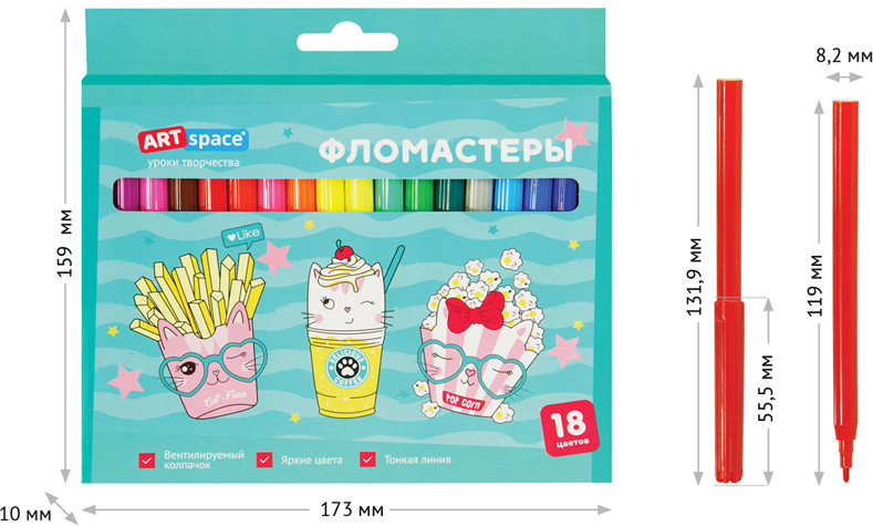 💳 Оплатить за товар можно при получении 🇰🇿 Есть бесплатная доставка по Казахстану от 1 дня 🎁 Копите бонусы с каждой покупки Серия: Кот-сластена Набор фломастеров. 18 ярких цветов. Вентилируемый колпачок, смываемые чернила на водной основе. Упакованы в картонную коробку с подвесом. |