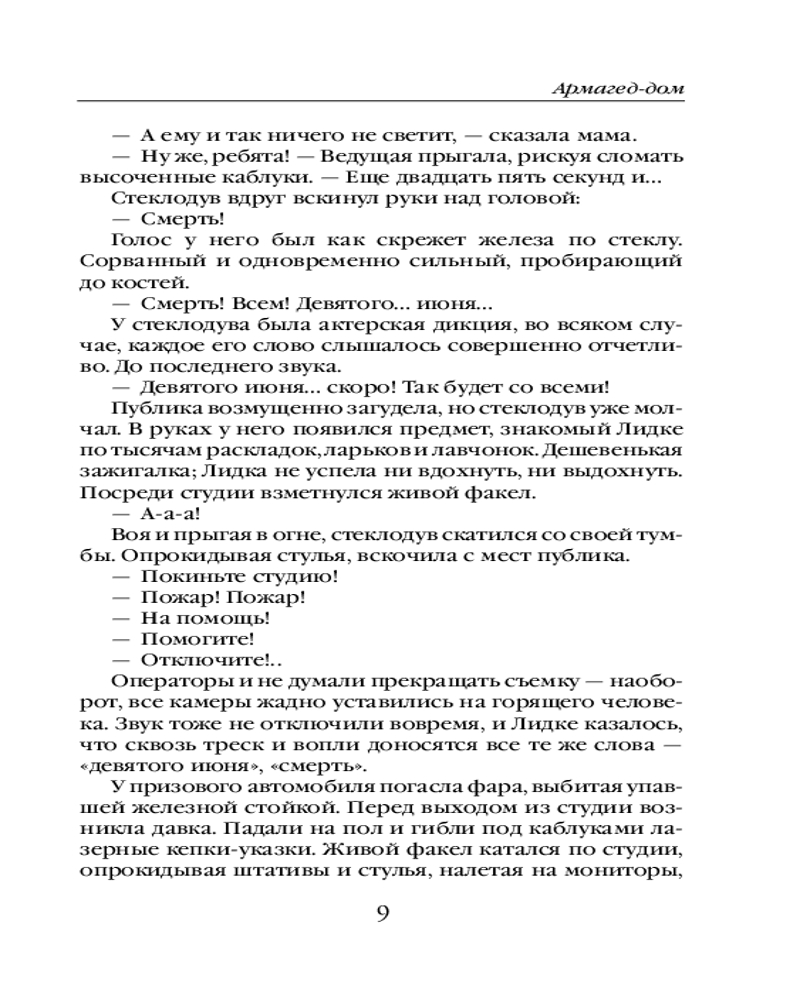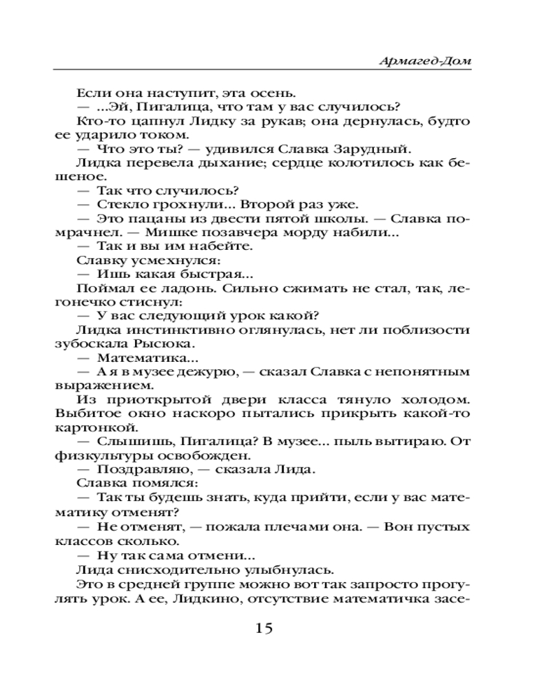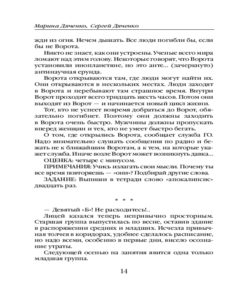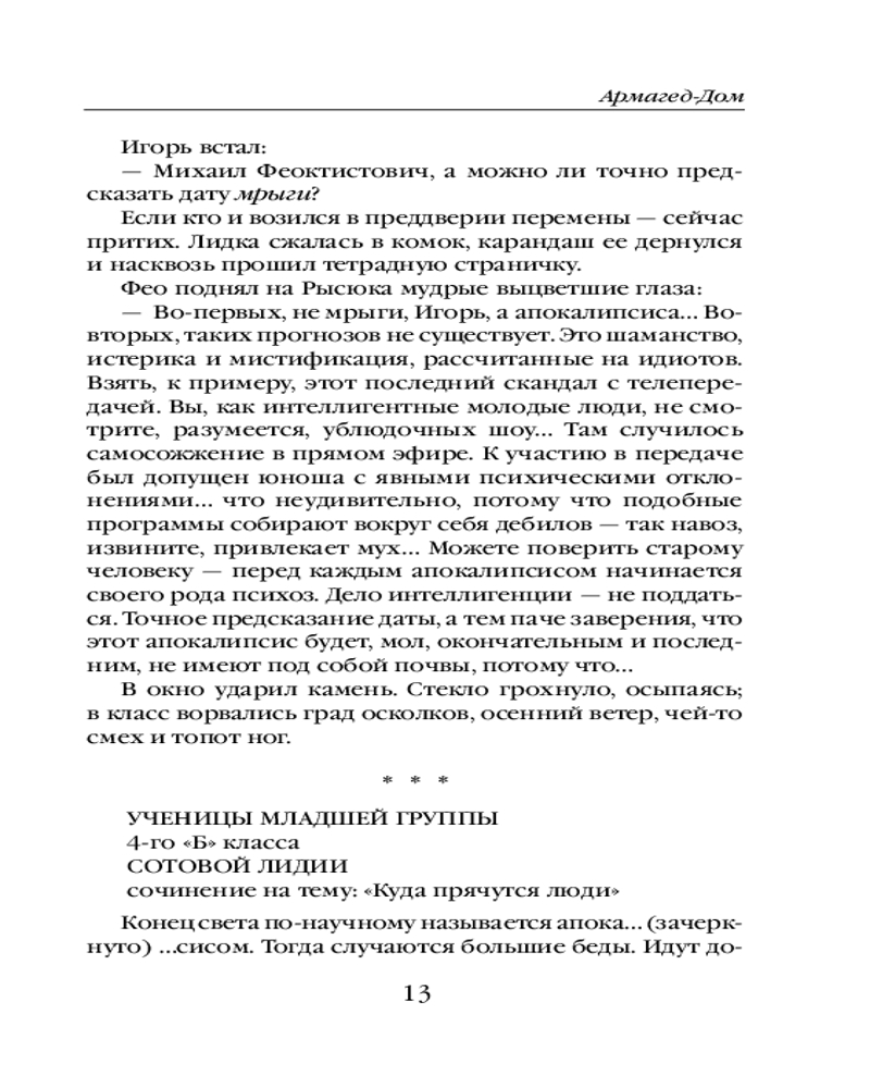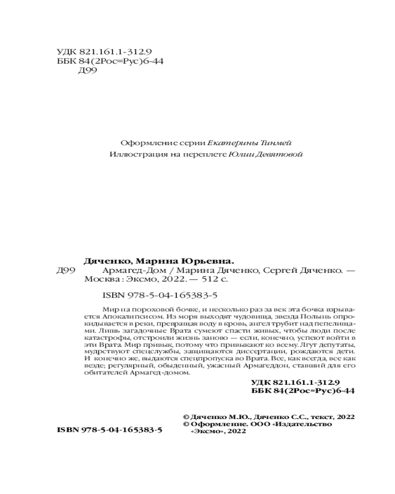 Армагед-ДомМарина Юрьевна Дяченко, Сергей Сергеевич Дяченко В данный момент этот товар отсутствует в продаже. Возможно, у нас найдется аналогичный или похожий товар здесь. Серия: Метафантастика Марины и Сергея Дяченко Мир на пороховой бочке, и несколько раз за век эта бочка взрывается Апокалипсисом. Из моря выходят чудовища, звезда Полынь опрокидывается в реки, превращая воду в кровь, ангел трубит над пепелищами. Лишь загадочные Врата сумеют спасти живых, чтобы люди после катастрофы, отстроили жизнь заново — если, конечно, успеют войти в эти Врата. Мир привык, потому что привыкают ко всему. Лгут депутаты, мудрствуют спецслужбы, защищаются диссертации, рождаются дети. И конечно же, выдаются спецпропуска во Врата. Все, как всегда, все как везде; регулярный, обыденный, ужасный Армагеддон, ставший для его обитателей Армагед-Домом. |