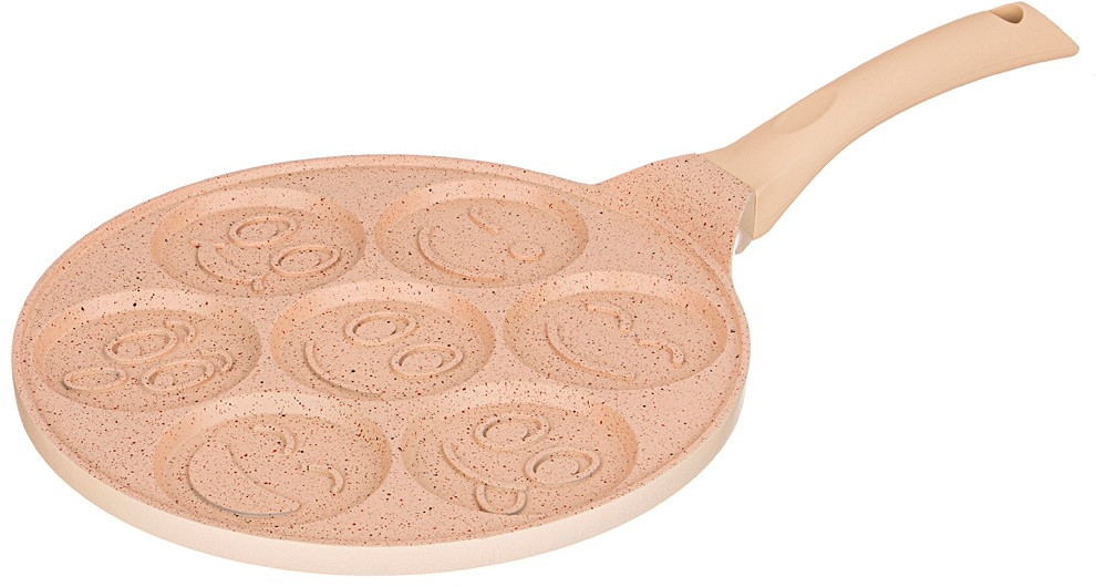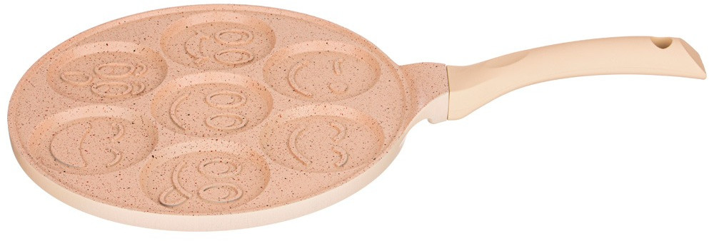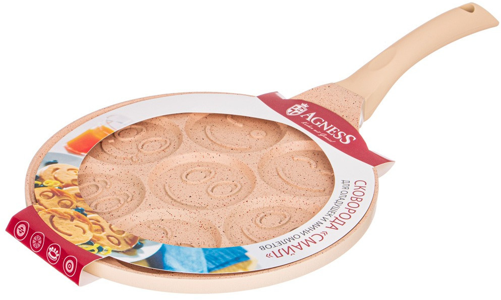Сковороды Agness серии «Смайл» выполнены из литого алюминия. Такая посуда отличается высокой теплопроводностью и устойчивостью к деформациям. Необычный дизайн сковороды позволит приготовить интересные и веселые оладушки и омлеты.