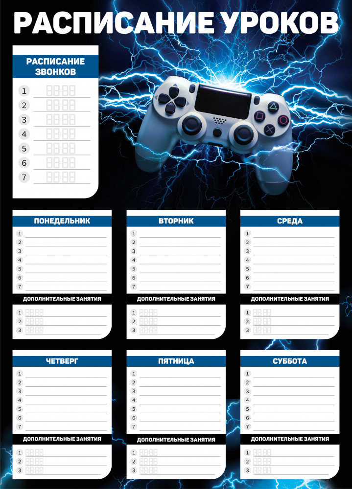 Расписание уроков поможет юному ученику привыкнуть к учебным будням, а школьнику в более старших классах, расписание поможет грамотно распределить выполнение уроков. Яркий дизайн понравится детям.