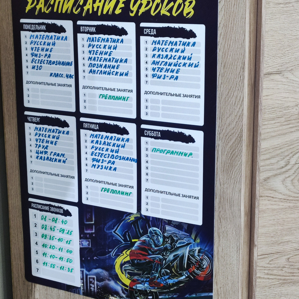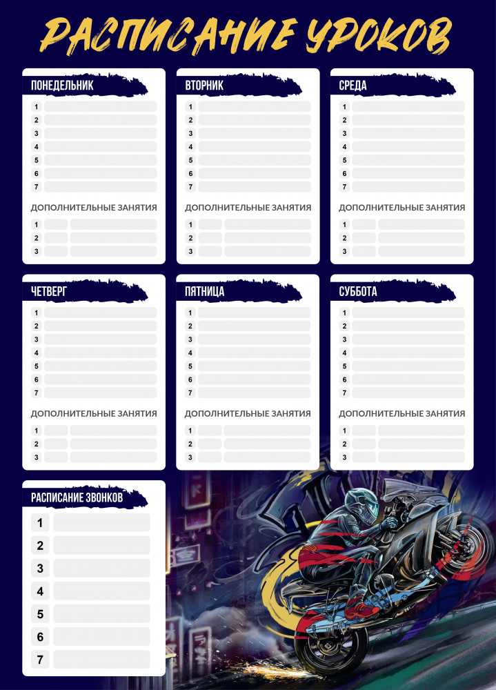 Расписание уроков поможет юному ученику привыкнуть к учебным будням, а школьнику в более старших классах, расписание поможет грамотно распределить выполнение уроков. Яркий дизайн понравится детям.