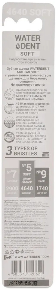 Waterdent Зубная щетка «Soft»В данный момент этот товар отсутствует в продаже. Возможно, у нас найдется аналогичный или похожий товар здесь. Деликатная чистка самых труднодоступных участков. Рекомендована в качестве ухода после стоматологических процедур, а также при чувствительности десен. 4640 активных щетинок диаметром 0,127 мм способствуют эффективному очищению эмали, бережной полировке зубной поверхности и мягкому массажу десен. Мягкая щетина бережно относится к зубам и деснам и беспощадна к зубному налету. Не повреждает десны и не создает микротрещины на зубной эмали. |