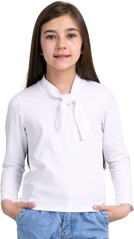 Лонгслив для девочки выполнен из кулира — легкого хлопкового полотна с лайкрой. Изделие с длинными рукавами, декорировано воротником, переходящим в эффектный галстук. Отличный вариант для школьницы на каждый день!