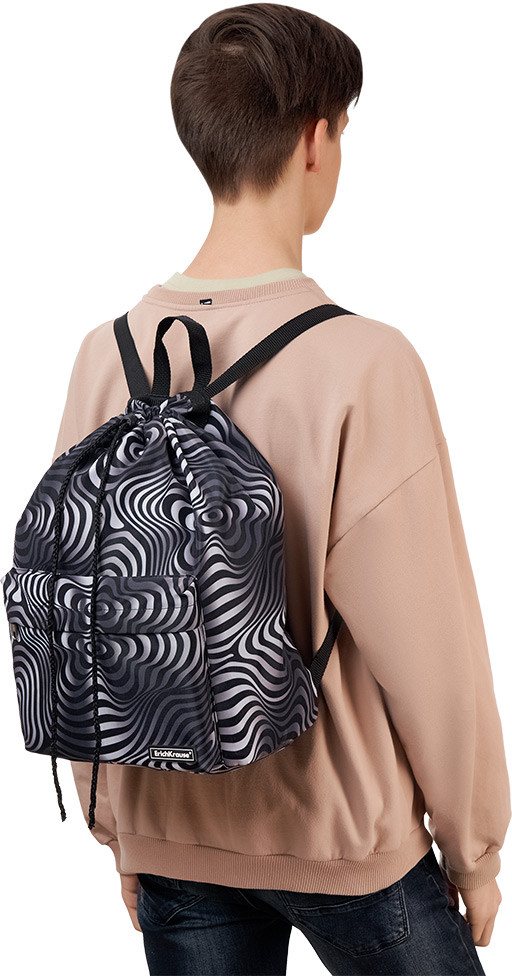 Серия: Illusion Универсальная модель, затягивается на шнурке. Материал: облегченный износо- морозостойкий водоотталкивающий 100% полиэстер, что позволяет компактно сложить рюкзак. Лямки из плотной стропы подходят для максимального использования объема. Места крепления лямок и ручки усилены дополнительными швами. Внутри одно вместительное отделение, снаружи большой передний карман на молнии. Надежная молния с мягким ходом оснащена бегунком с логотипом ErichKrause. |