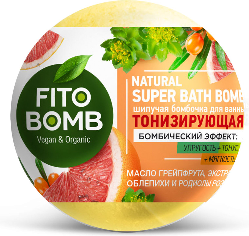 Фитокосметик Бомбочка для ванны тонизирующая с маслом грейпфрута, экстрактом облепихи и родиолы розовой «Natural super bath bomb»