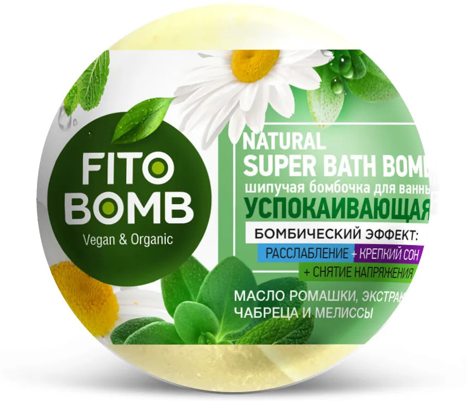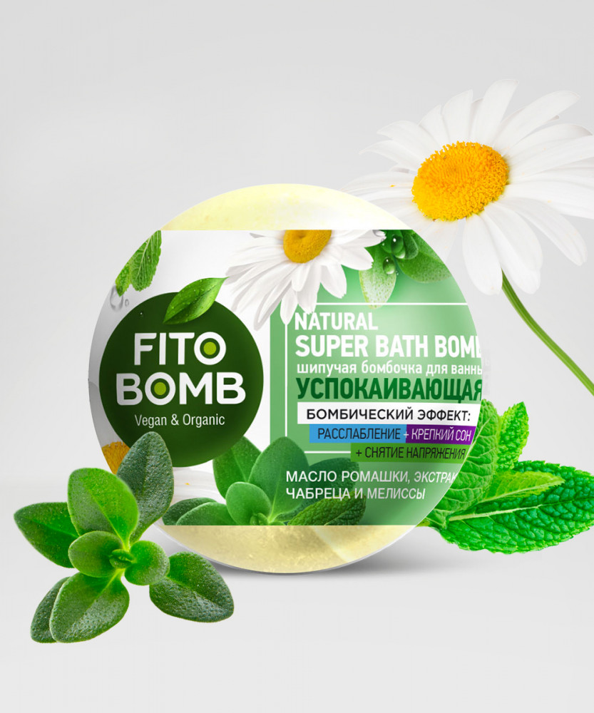Фитокосметик Бомбочка для ванны успокаивающая с маслом ромашки, экстрактами чабреца и мелиссы «Natural super bath bomb»