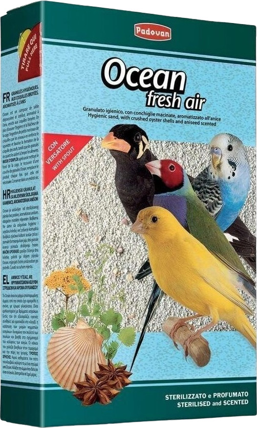 «Ocean fresh air» — гигиенический кварцевый наполнитель для птиц с измельченными ракушками. Ароматизированная анисом смесь из морского песка и дробленых раковин моллюска, является не только прекрасным наполнителем, но и источником кальция, необходимого для здорового пищеварения птиц. Присутствие камешков увеличивает перистальтику (мышечную активность) и степень перемалывания корма, что повышает его перевариваемость и усвояемость минимум на 10%.