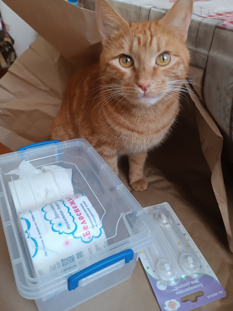 Будете смеяться, но контейнер приобрела вот из-за этой рыжей мордахи. Туалетная бумага для него лучшая игрушка. Что только не делала, какие не покупала подвесные средства для туалетной бумаги, Бакс своего добьется, устроит себе "пенную" вечеринку. Один был полностью закрытый, так он его сорвал с навесов и сломал. Пластик по видимому был хлипкий, если даже кот с ним справился.🤔 Уже подумывали сейф покупать.🤣 Этот контейнер большой, прекрасно помещается два рулона. Защелкивается крепко. Бакс уже проверил. Контейнер лёгкий и он его сбросил, пытаясь добраться до бумаги. Как бы не так, видит око, да зуб не ймёт.😜Контейнеру ничего не сделалось, не треснул, не открылся. Хотя на вид пластик тонкий, но крепкий. Надеюсь до Бакса дойдет, что ему до бумаги не добраться и отстанет от него.