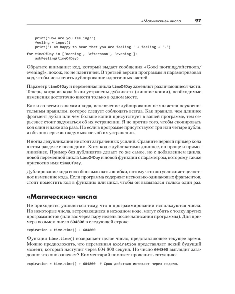 Такие навыки поднимут вашу ценность как программиста не только в Python, но и в любом другом языке. Ни одна книга не заменит реального опыта работы и не превратит вас из новичка в профессионала. Но «Чистый код для продолжающих» проведет вас чуть дальше по этому пути: вы научитесь создавать чистый, грамотный, читабельный, легко отлаживаемый код, который можно будет назвать истинно питоническим. |