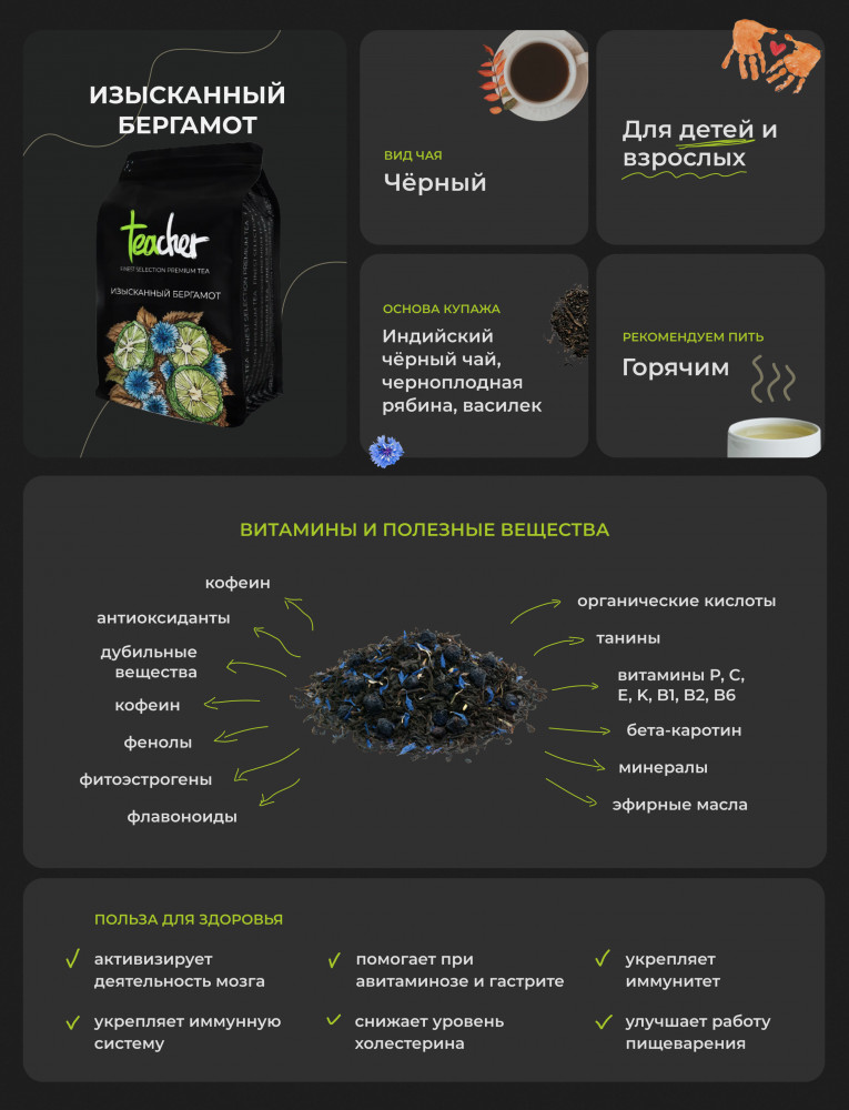 Teacher Чай черный «Изысканный бергамот»В данный момент этот товар отсутствует в продаже. Возможно, у нас найдется аналогичный или похожий товар здесь. Индийский черный среднелистовой чай с добавлением лепестков василька, ягод черноплодной рябины и насыщенным вкусом бергамота. Бархатистость и терпкость гармонично сочетаются с кислинкой, а бергамот добавляет приятный сливочный привкус. Напиток с пряным и одновременно освежающим бергамотовым ароматом согревает, восстанавливает душевное равновесие и напоминает о цитрусовых садах Средиземноморья. Этот ароматный микс поднимает настроение, бодрит и оказывает общее укрепляющее действие на организм. |