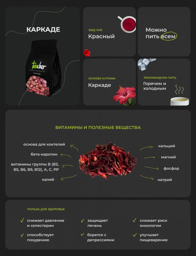 Teacher Чай «Каркаде»В данный момент этот товар отсутствует в продаже. Возможно, у нас найдется аналогичный или похожий товар здесь. Яркий экзотический Каркаде — это настой из заваренных цветков гибискуса. Отлично освежает и утоляет жажду. Для приготовления чая используются бутоны и соцветия. Собирают соцветия вручную и сушат в особых условиях, чтобы сохранить все полезные свойства. В арабских странах этот приятный кисло-сладковатый напиток с тонким, но стойким цветочным ароматом издавна считался лекарством от всех болезней. Каркаде даже величественно называют «напитком фараонов»: еще в Древнем Египте знали о его целебных свойствах. Можно употреблять как горячим, так и охлажденным. |